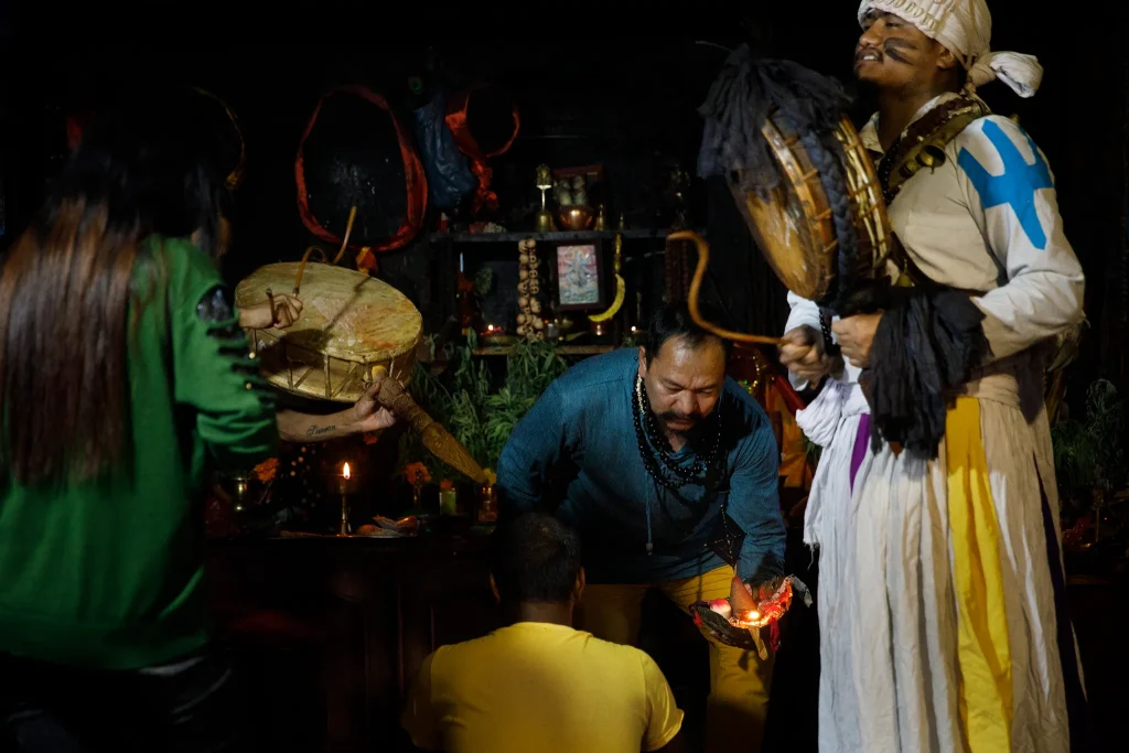The interplay of sound, colour, movement, and natural elements forms an intensely sensory atmosphere, with the ritual space carefully prepared as a sacred environment dedicated to healing, protection, and connection with the forces of nature.